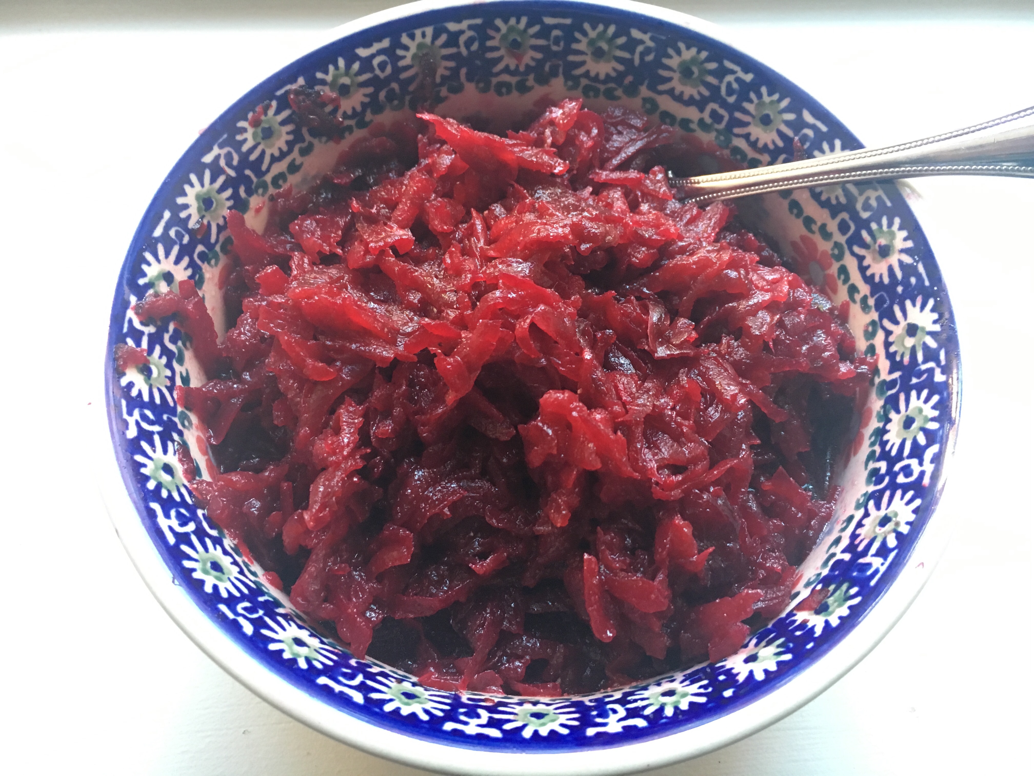 This recipe is for a simple (but potentially messy) shredded beet salad can be served as a side or accompaniment for lunch or dinner. By the way, if you get beets with the stems and leaves, don’t discard them. They are very healthy and you can cook the greens down with some garlic and lemon!