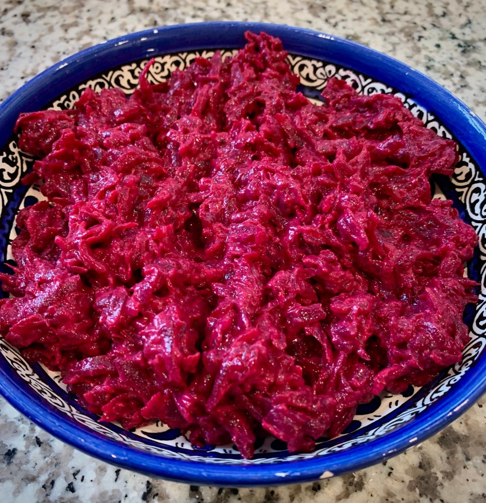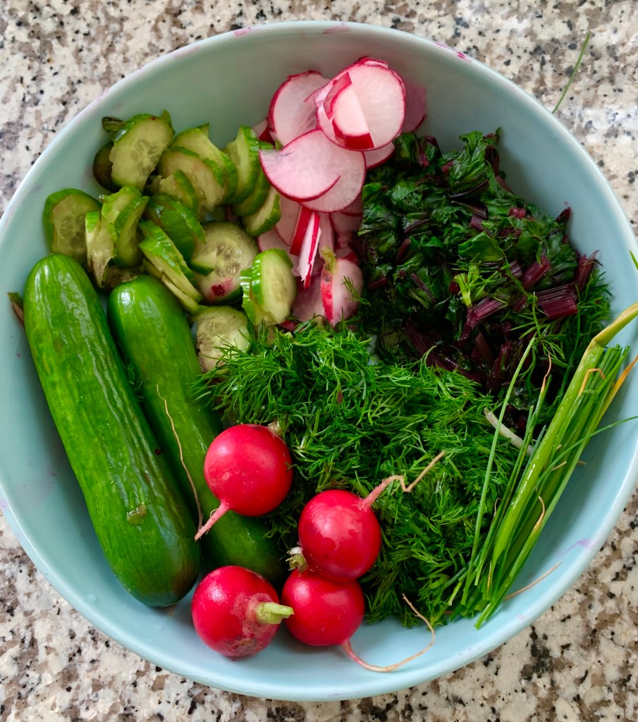 The last few days have felt hotter than satan’s kitchen on the 4th of July. If you find yourself melting under the sun, craving something light and refreshing, consider chłodnik! Chłodnik is a chilled barszcz (aka borscht) that is usually mixed with kefir and/or sour cream, creating a vibrant pink soup! The Polish answer to gazpacho. Does it sort of taste like a salad in soup form? Tak. Does the color remind one of pepto? Mayhaps! But it is yummy and pretty easy to put together, so give it a go! One note in ingredients…get a bunch of beets with the greens still attached. If you can only find loose beets, no prob, just add one bunch of Swiss chard or even lacinato kale.