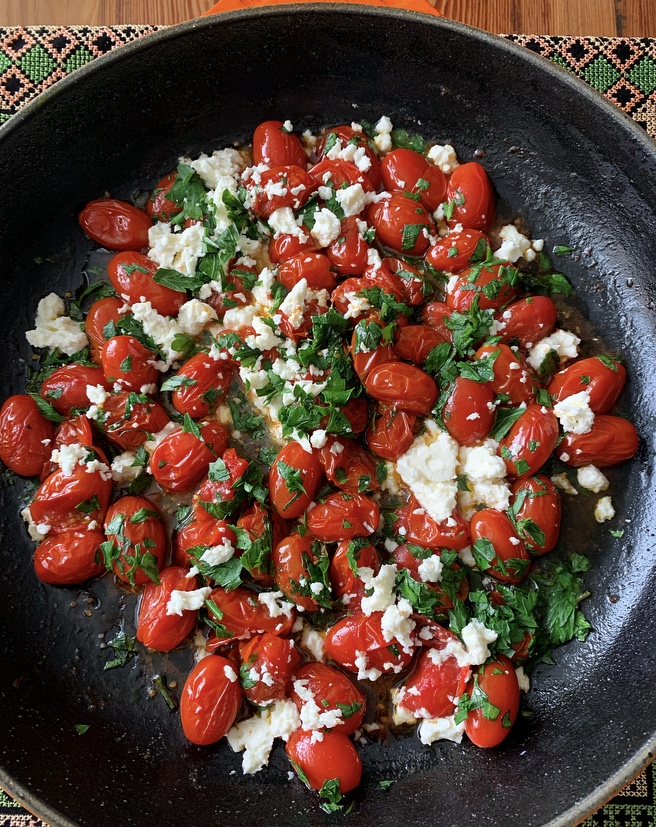 Remove the blackest bits of skin from the red pepper and add it to a blender or food processor along with parsley. Pulse 5-10 times, or until you get the consistency of a salsa. Add to the pan and cook for another 10 minutes over medium heat.